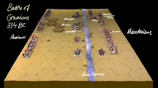 My son has been back with us for the week on holiday as well as some lovely walking and drinking slightly too much whiskey we have managed some gaming. Whilst I can’t get him to play a full wargame we have enjoyed Command and Colors and with my new hex terrain I can now get this on the table using figures. He has recently been reading about Alexander the Great so we picked The battle of Granicus he would play the Macedonians I the poorly led Persians ! Not too many photos….